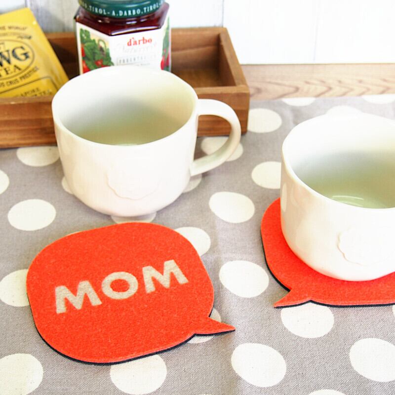 ふきだし型のコースターです。フェルト生地の裏にEVAを貼り合わせています。